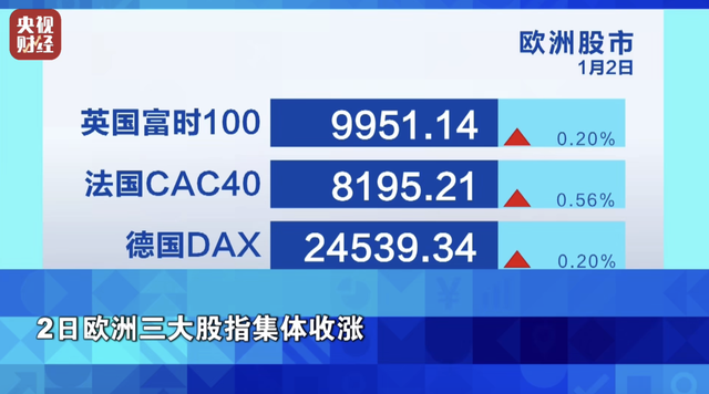 欧洲市场方面,受宏观经济预期改善、板块轮动及投资者风险偏好回升等因素共同驱动,欧洲三大股指全线上涨,其中,英国富时100指数盘中首次突破一万点整数关口,触及10046.25点,此后小幅回落至9951.14点,涨幅为0.20%,法国CAC40指数涨0.56%,德国DAX指数涨0.20%。